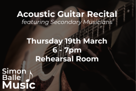 The Acoustic Guitar Recital will take place on Thursday 19th March in the Rehearsal Room at 6pm. This recital will feature Mr Niesyto’s students. Recitals are a fantastic performance opportunity with a live audience, and are a great way to develop your musical skills. We are looking forward to celebrating Mr Niesyto’s students. What do … Continue reading Acoustic Guitar Recital | March 2026